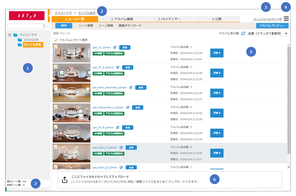 | 7. シーン数合計 | 作成済みのシーン数、ご利用可能な最大シーンが表示されます。 |