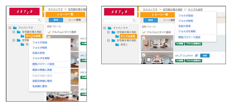 | フォルダを複製 | フォルダを複製します。 フォルダに含まれるパノラマ画像他、全てのデータが複製されます。 ※複製したコンテンツのURLは変更されます。 |