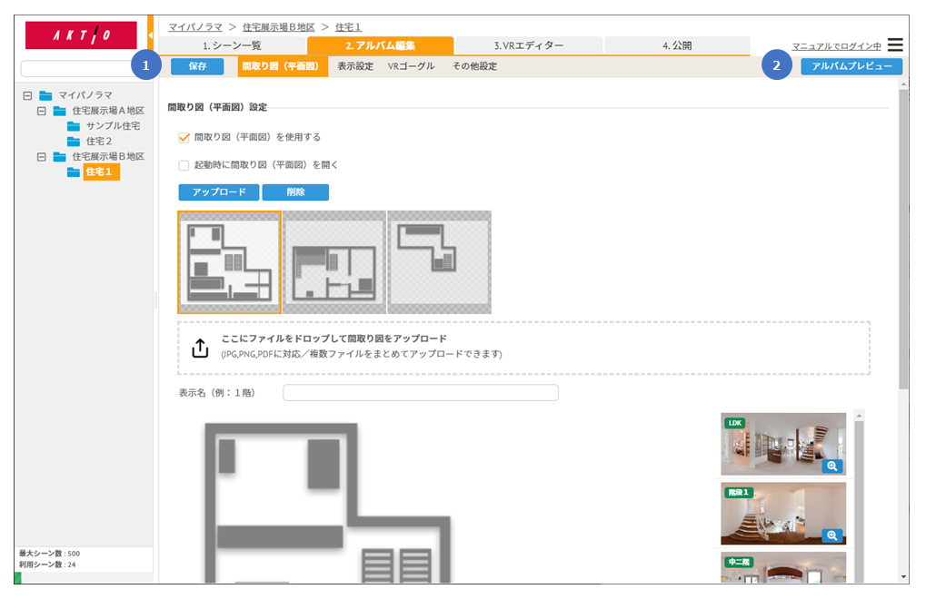 間取り図(平面図)設定では、間取り図(平面図)を登録して、シーンを図面上に割り付けることができます。