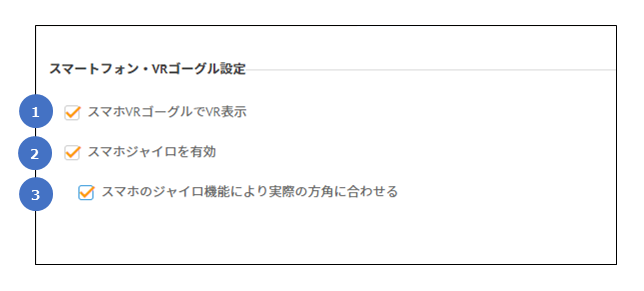 | 1. スマホVRゴーグルでVR表示 | VRゴーグルを利用可能にします。 |