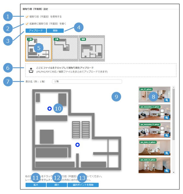 | 9. 間取り図(平面図)表示 | 割り付けられているシーンを間取り図上にポイントで表示します。 |