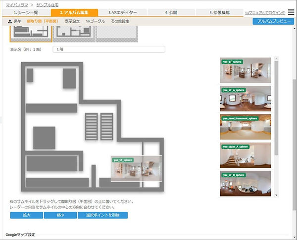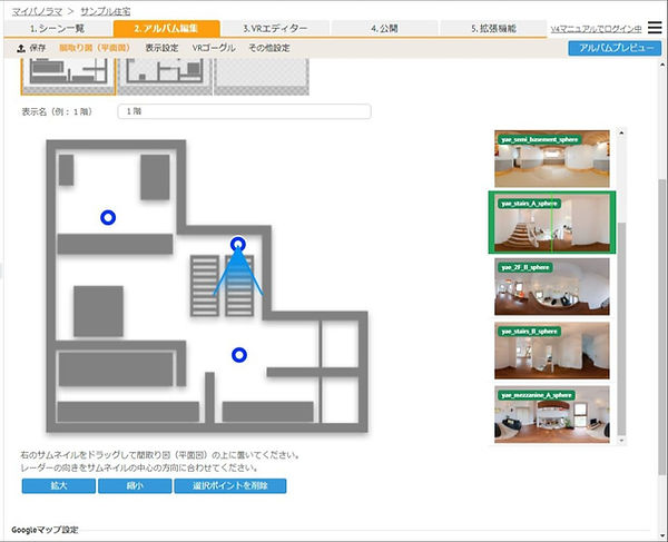 間取り図が複数ある場合は、サムネイルをクリックし間取り図を切り替え、シーンを配置してください。