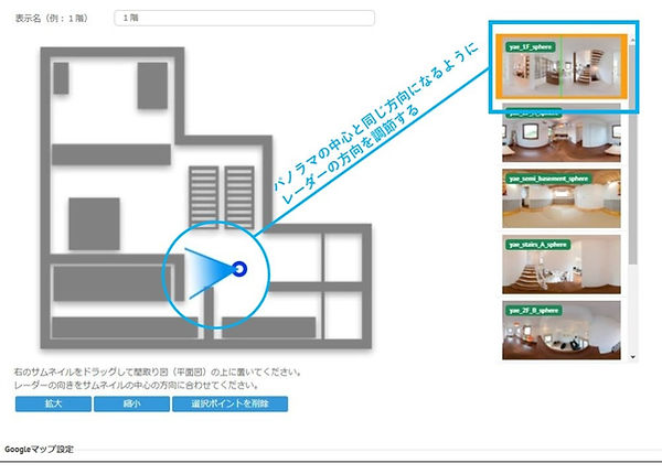 サムネイルに緑線で示されているパノラマ画像の中心が初期表示位置となりますので、レーダーをドラッグしてパノラマ画像の中心と同じ方向になるよう調節してください。