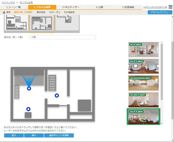 | 8. シーン一覧 | アルバム登録されているシーンの一覧をサムネイル表示します。 サムネイルを間取り図にドラッグすることで、シーンを割り付けることが出来ます。 サムネイルを選択すると、初期表示位置がサムネイル上に緑線で示されます。 サムネイル右下の拡大アイコンをクリックすると、サムネイルを拡大表示すいることができます。 |