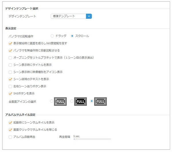 表示設定では、デザインテンプレートや各種ボタンの表示など、アルバムの外観を設定できます。