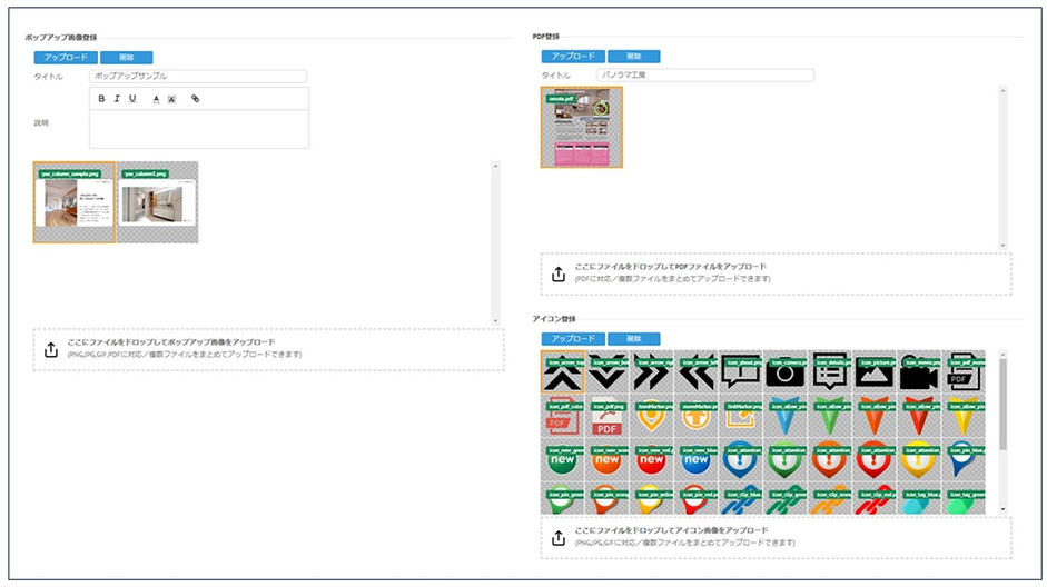 | 1. アップロード | ポップアップ画像をアップロードします。 複数画像をまとめてアップロードできます。 ※ポップアップ画像は、VRエディターからもアップロードできます。 下部にあるファイルアップロードエリアに、直接ファイルをドラッグアンドドロップしてアップロードできます。 |