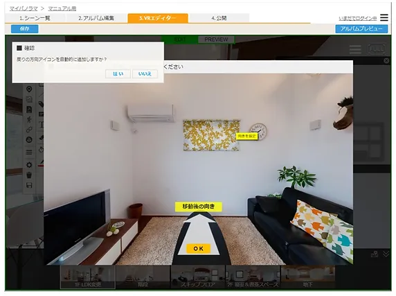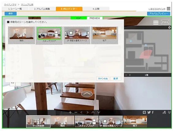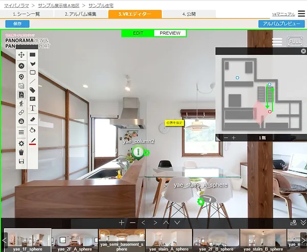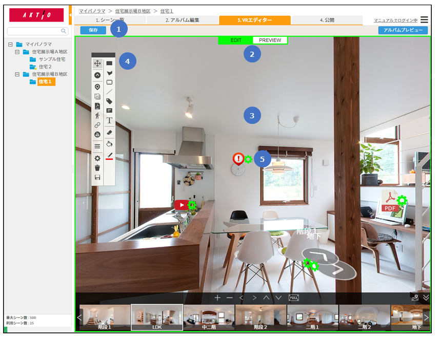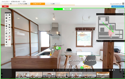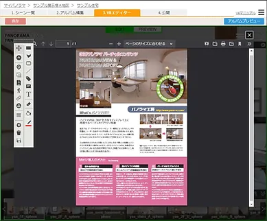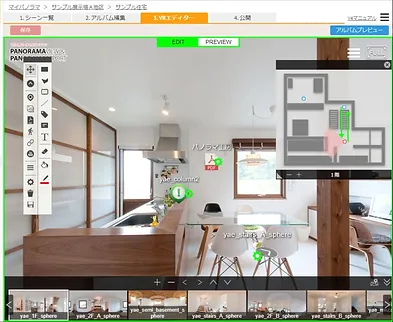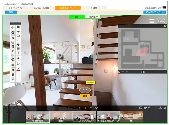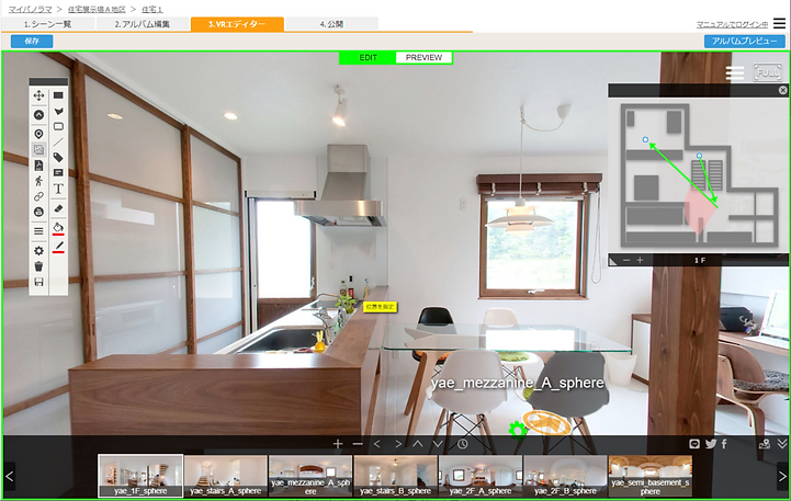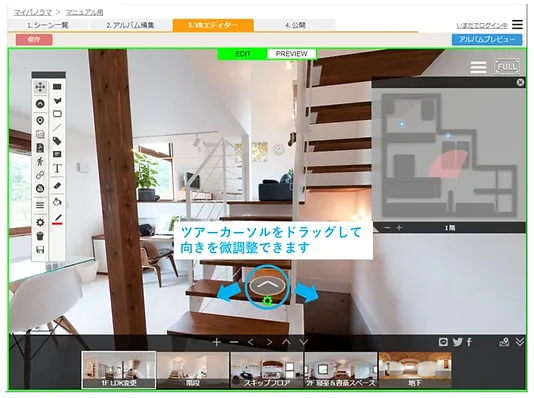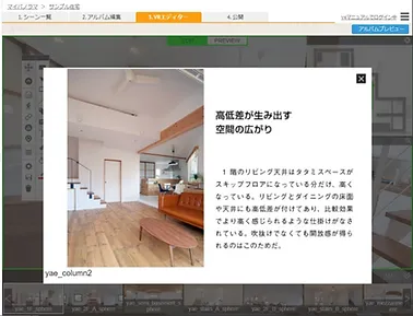 | 3. 編集画面 | バーチャルツアーの編集画面です。実際のアルバムと同じ表示設定を確認できます。 |