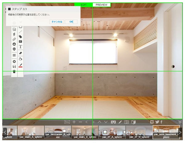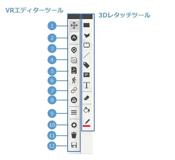 VRエディターでは、ツールボックス内の各種ツールを使用してバーチャルツアーを編集します。