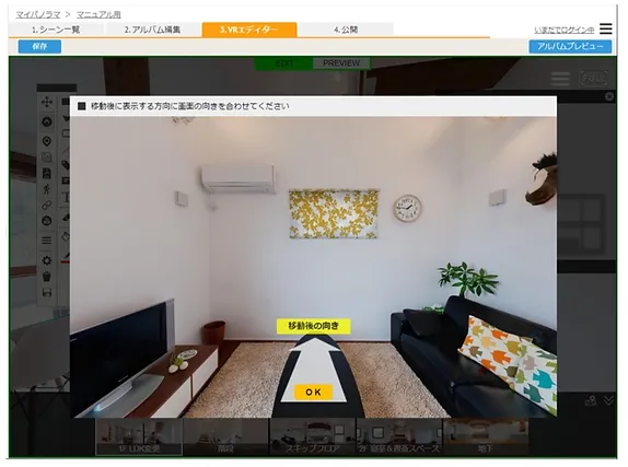 パノラマをドラッグして、移動したい方向に視線を向けて、「OK」をクリックしてください。