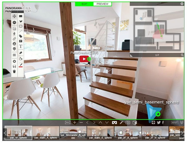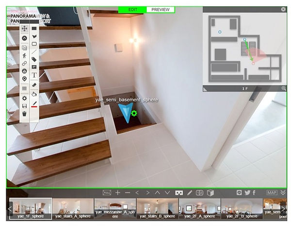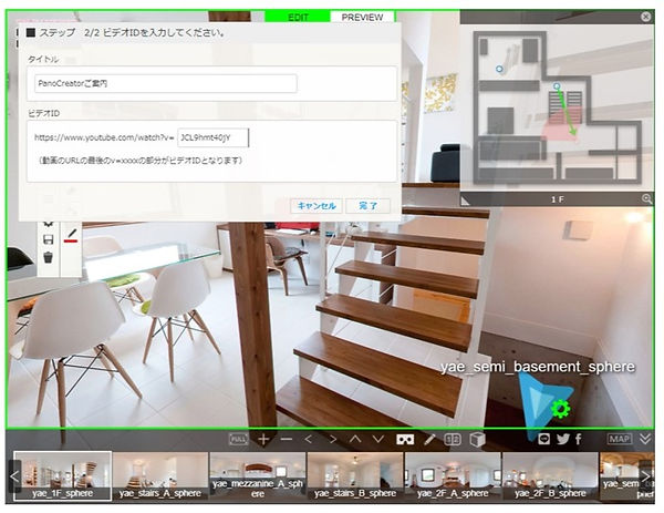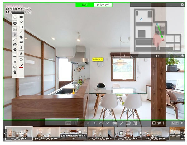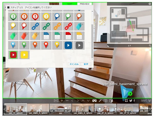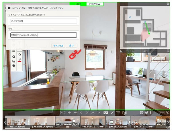 | 2. 編集モード切替 | ①EDIT バーチャルツアーの編集モードにします ②PREVIEW 作成したバーチャルツアーを確認します |