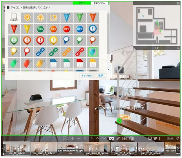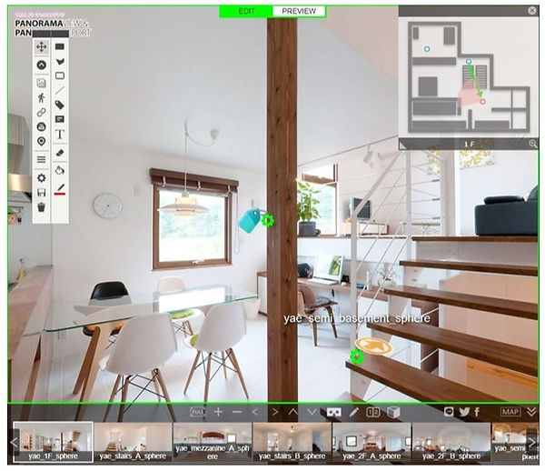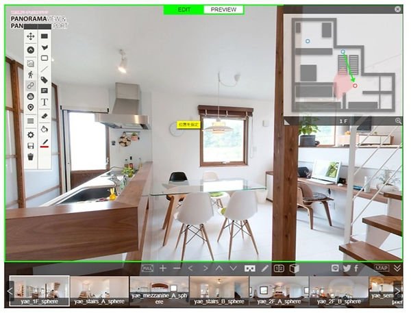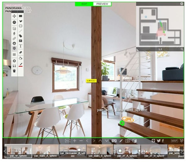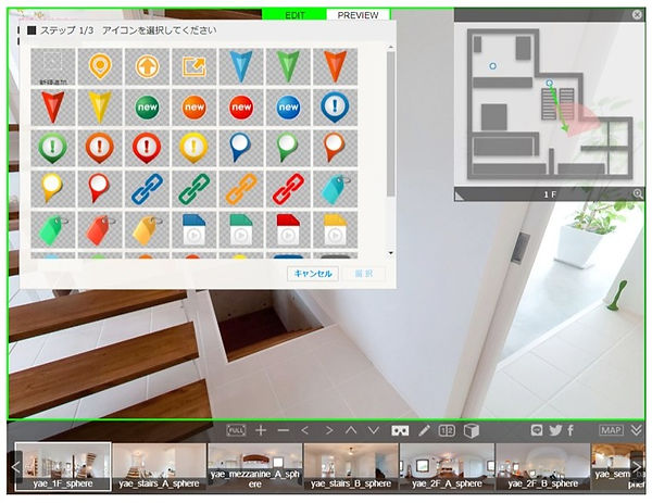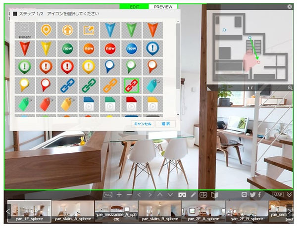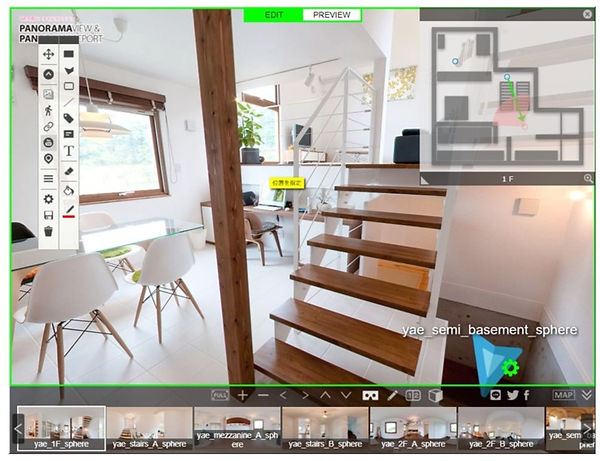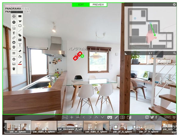 VRエディターでは、コンテンツの実際の仕上がりを確認しながら、シーンの移動やポップアップアイコンなどを配置して、バーチャルツアーを作製できます。