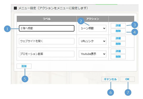 | 2. アクション | メニュークリック時のアクションを設定します。 アクションは以下から選択できます。 ①ポップアップ表示 ②シーン移動 ③URLリンク ④Youtube表示 ※各アクションの動作は、アイコンでの設定と同様です。 |